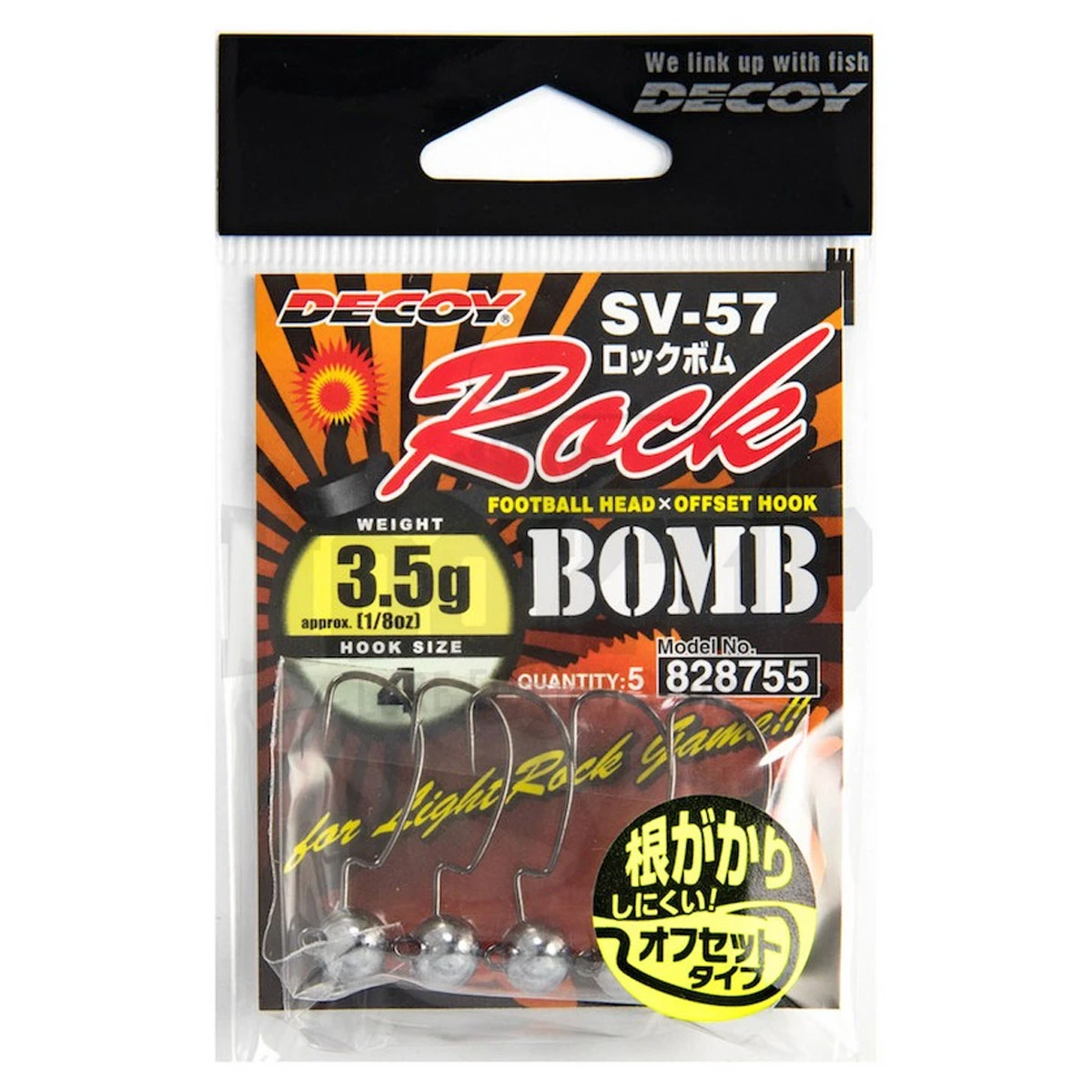 De Rock Bomb SV-57 van Decoy maakt weedless vissen gemakkelijk. De offset haak wordt rechtstreeks in de loodkop gegoten. Of het nu gaat om creatures, worms, twisters of shads met schoepstaart, alle soorten aas kunnen met de Rock Bomb heel gemakkelijk weedless worden gepresenteerd. De football kop voorkomt op betrouwbare wijze dat het aas op de bodem omvalt en zorgt ervoor dat de haak altijd rechtop staat.