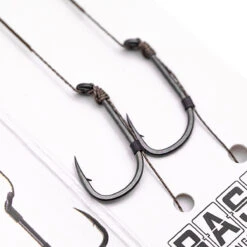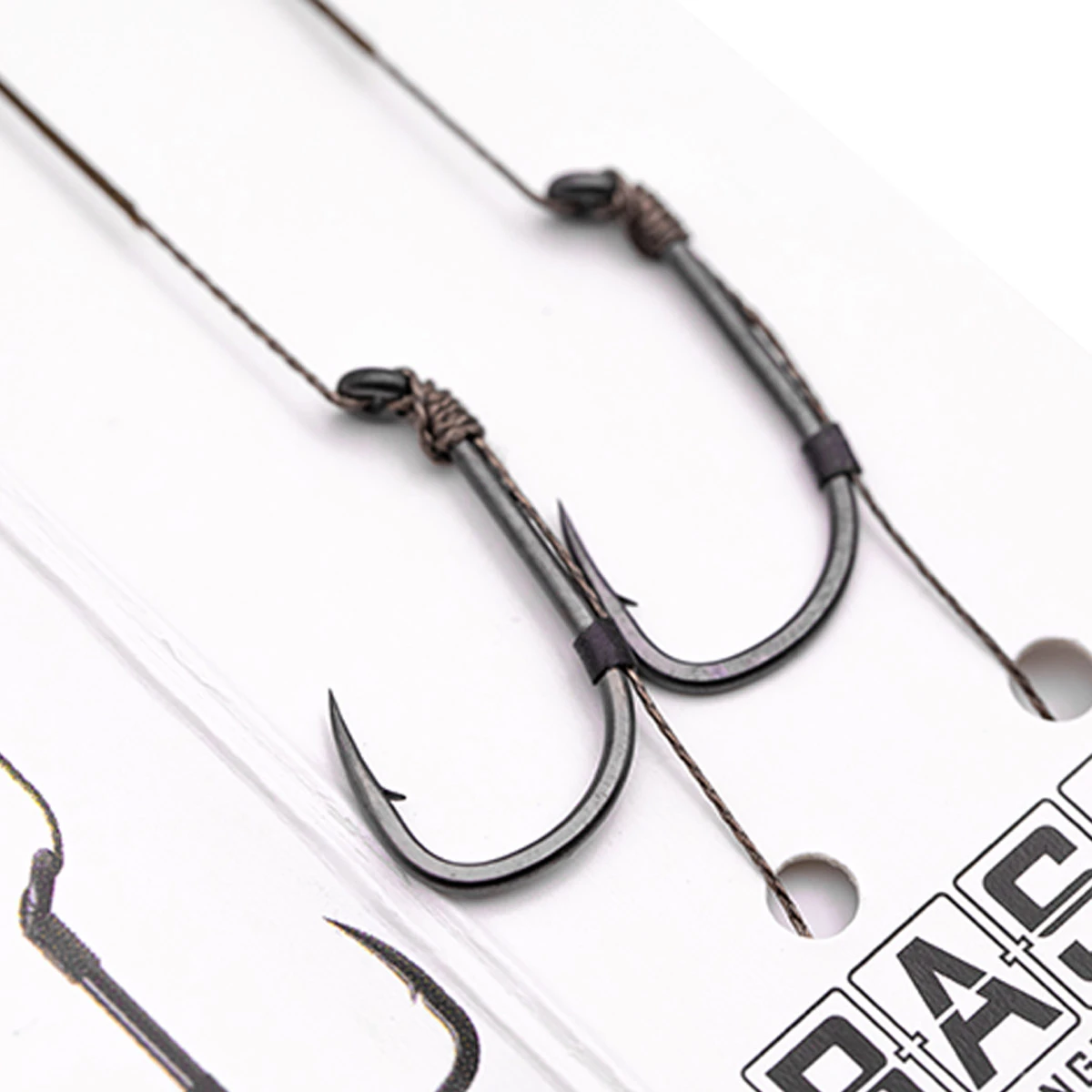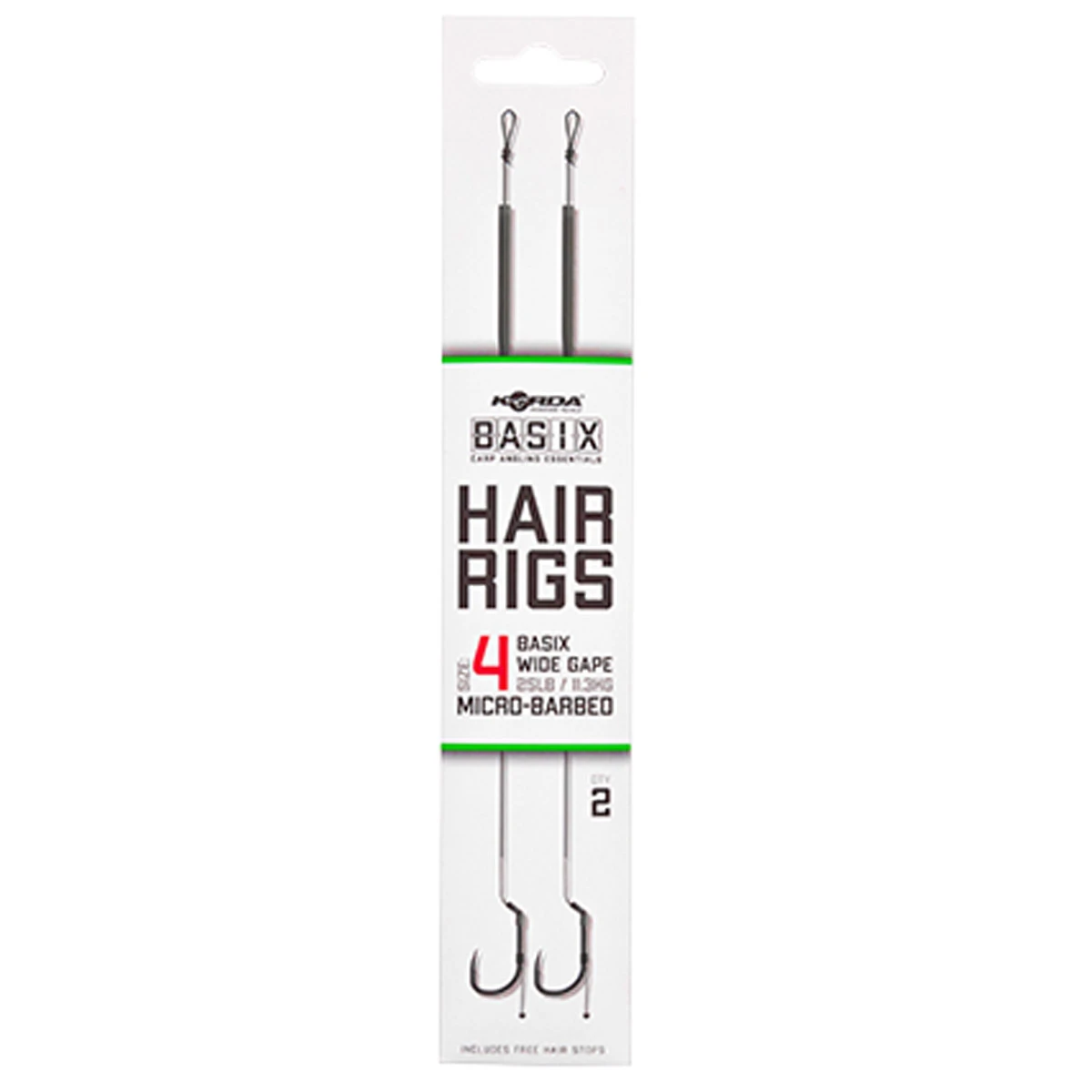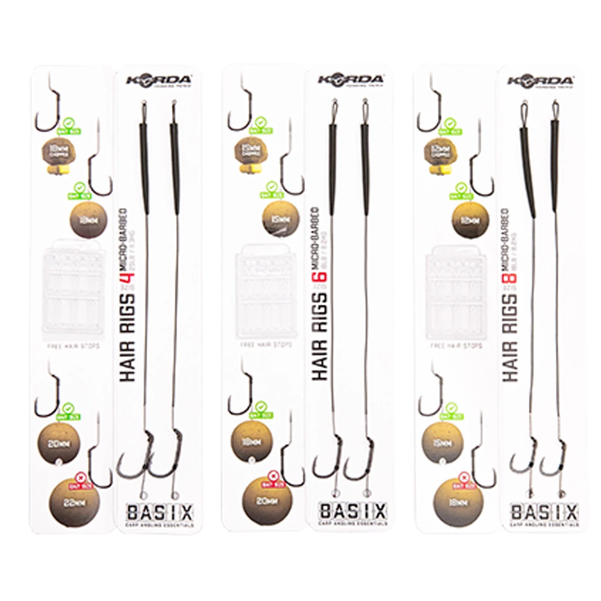 De Basix Ready Tied Hair Rigs zijn klaar om gelijk uit de verpakking gebruikt te worden. Je hoeft enkel nog een bodemaas of wafter toe te voegen en je bent klaar om te vissen. De rigs zijn geknoopt met het camo green gekleurde Basix Coated Hooklink materiaal. Een klein gestript stukje bij de Basix Wide Gape haak zorgt voor bewegingsvrijheid en grotere kans op goede inhaking. De onderlijn heeft een soepele hair die is voorzien van een stukje silicone die hem op zijn plek houdt en de kans op in de war werpen verkleint. De lengte van de hair is geoptimaliseerd voor haakaas formaten die passen bij de gekozen haakmaat.